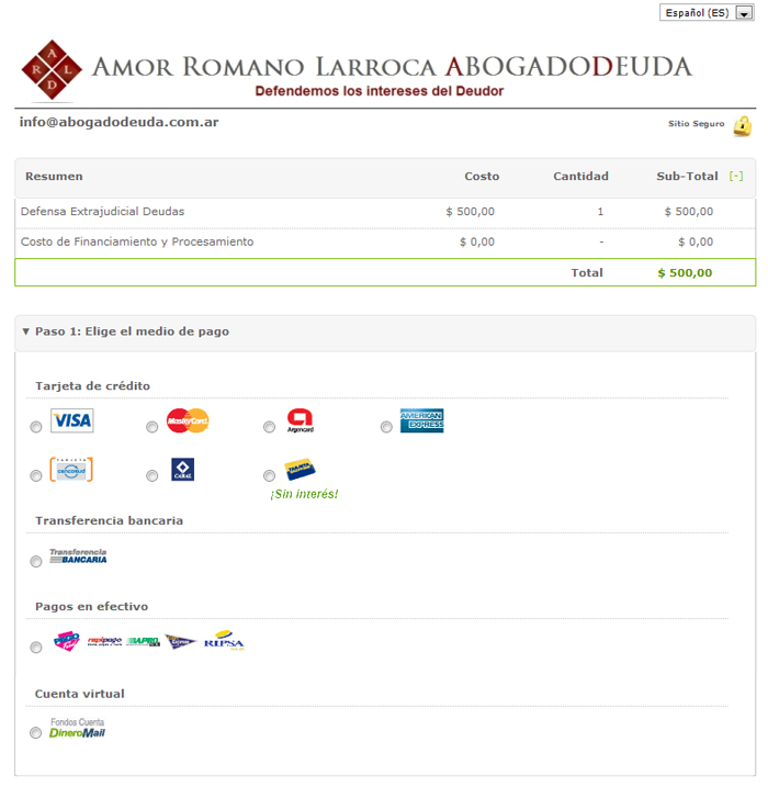 En cuanto hace click en el botón Contrate Ya!, usted será dirigido a la página de DineroMail para que seleccione la forma de pago que más se adecúe a sus necesidades.